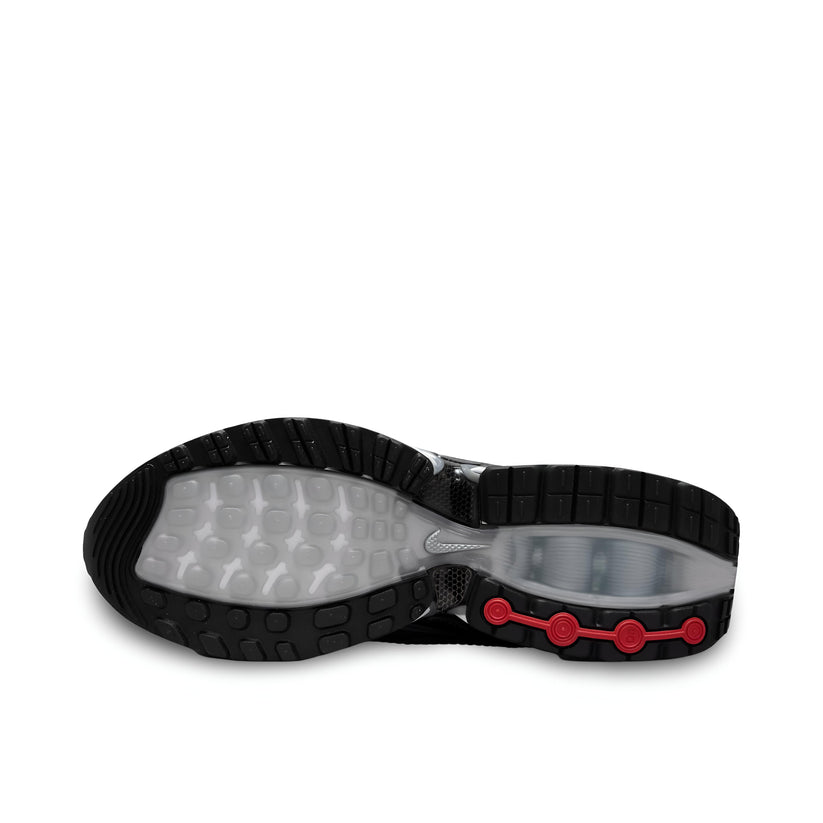 The upper combines lightweight, multi-layered mesh with durable textiles and silicone overlays, delivering outstanding breathability and a distinctive tactile texture. The metallic silver and white colorway adds a futuristic, versatile aesthetic that stands out while complementing any outfit. Stability is enhanced by an exaggerated TPU midfoot shank, and the rubber outsole with Waffle-style grip pads ensures excellent traction and durability.